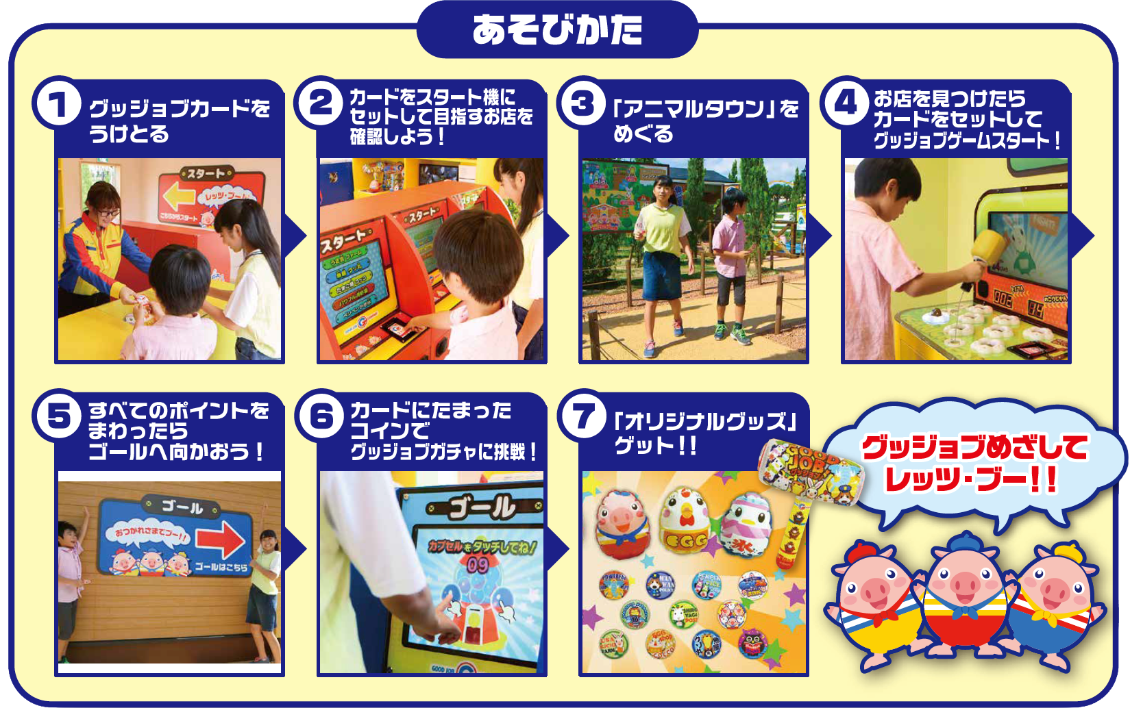 カラフルな街"アニマルタウン"を巡って体を使ったいろんなゲームが楽しめるよ♪個性豊かなアニマルたちとのフォトスポットも満載★大人も子どもも一緒に楽しめるゲームラリーアトラクション!オープンまで楽しみに待っていてね(^^)